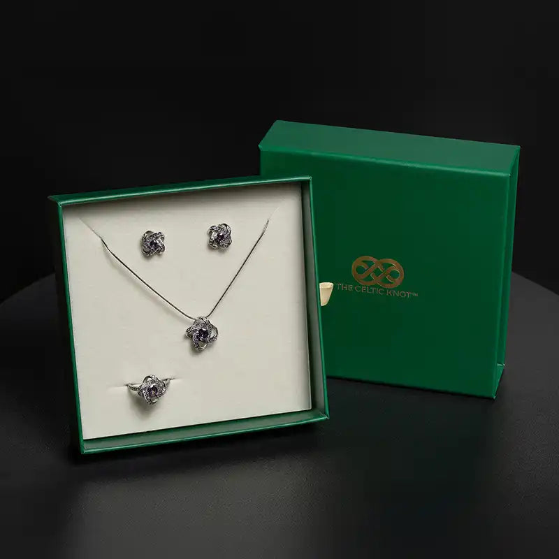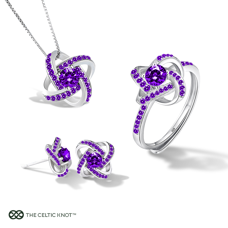 The Amethyst Trinity Set brings together the pendant, earrings, and ring for the February-born or purple-lover who truly deserves the royal treatment. This complete collection means she can adorn herself in amethyst from ears to finger – a sparkling symphony of Celtic knotwork and velvety purple gemstones.