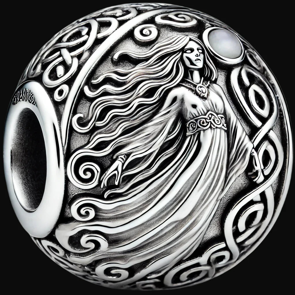 Designed in luminous sterling silver with 18K white gold plating, this charm might feature a small teardrop harp-like musical note entwined with Celtic knotwork – symbolizing the banshee’s tears turned to music.