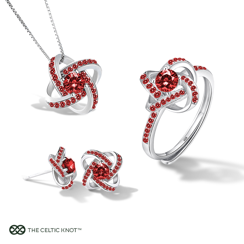 This is a gift for when only the absolute best will do – an entire suite of ruby-adorned Celtic jewelry, each piece echoing the others in fiery beauty. From her ears to her neck to her hand, she’ll be draped in matching symbols of love, courage, and heritage.