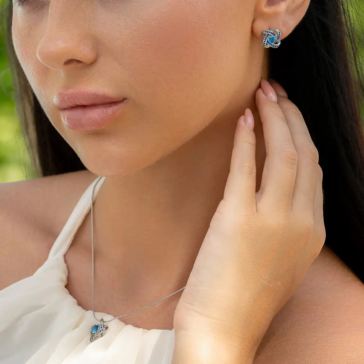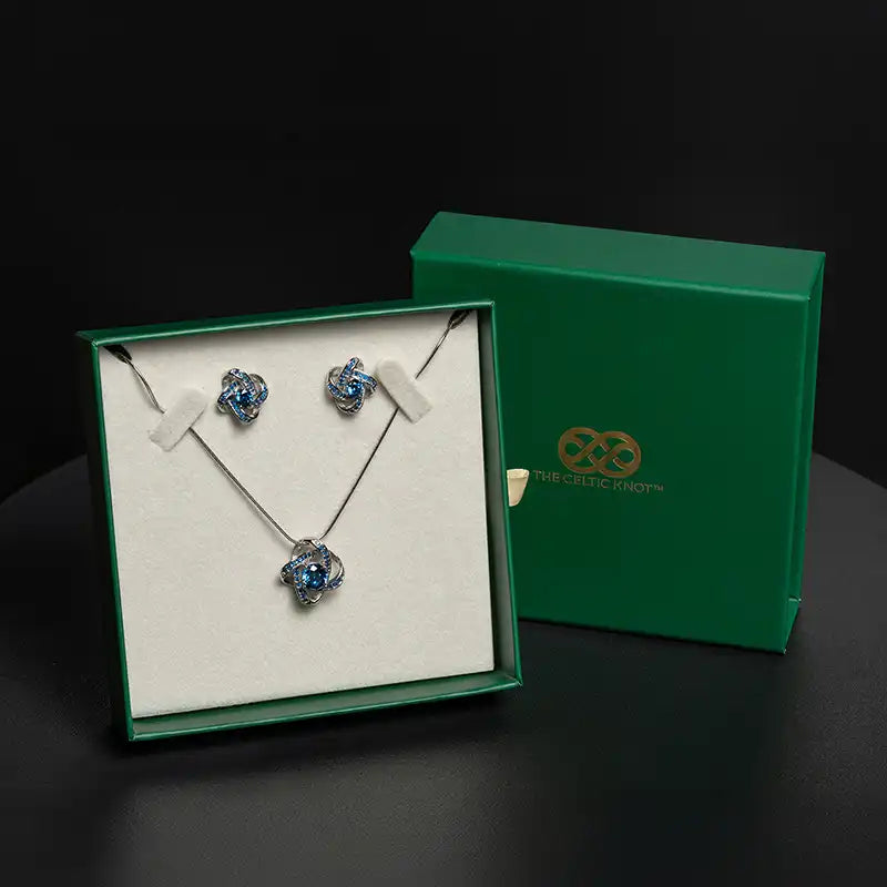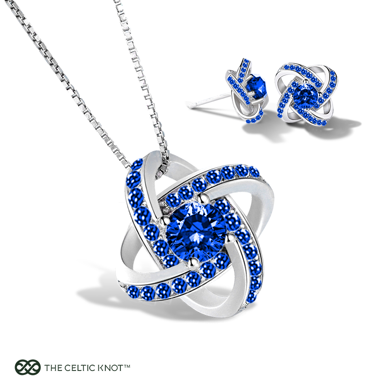 Our Sapphire Duo Set combines the Celtic Knot sapphire pendant and matching earrings into an exquisite September birthstone suite. Both pieces mirror each other with gleaming sky-blue gems and elegant knot designs, giving her a polished, put-together look whether she’s in a casual sweater or a dressy ensemble.