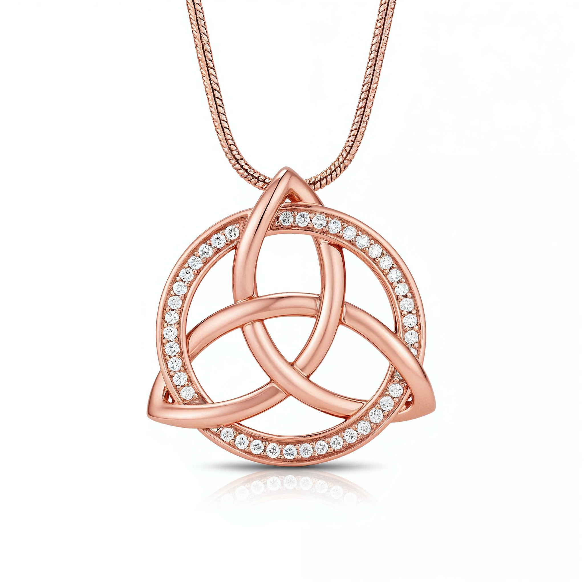 The Trinity Knot has guarded Irish hearts for five millennia. Carved into ancient stones, etched into monastery walls, whispered into blessings that crossed oceans with emigrants who carried nothing else. Now it rests at her collarbone—a quiet declaration that she belongs to something older than memory.