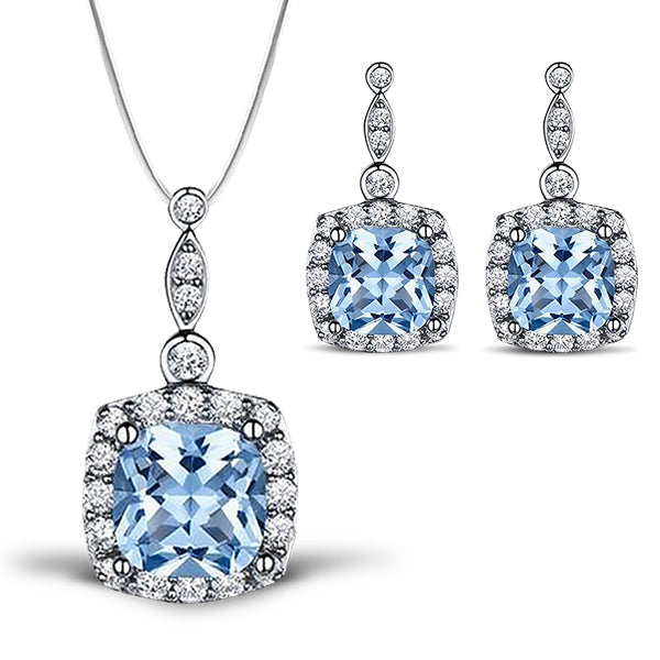 - Included Pieces: Winter Diamond Pendant (18K white gold finish, blue topaz center stone on 18"+4" adjustable chain) + Winter Diamond Earrings (18K white gold finish, blue topaz drop studs) – a perfectly matching set
