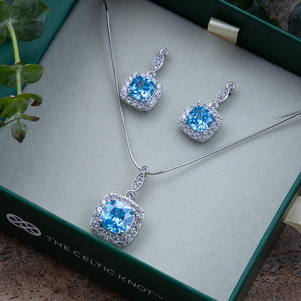 Beyond their beauty, the Trinity Knot motifs in this set carry profound significance. The Triquetra has long symbolized the power of three in Celtic lore – be it the Maiden, Mother, Crone of womanhood or the Father, Son, Holy Spirit of faith – ultimately it speaks to an unbreakable bond and the idea that good things come in threes. When you wear both the pendant and earrings, you’re essentially wrapping yourself in double the symbolism and style. Crafted from fine sterling silver with 18K white gold, and adorned with genuine blue topaz gemstones, these pieces radiate a serene blue light that calms the soul and delights the eyes. From a casual lunch to a festive family gathering, this versatile set complements any outfit with its timeless elegance.