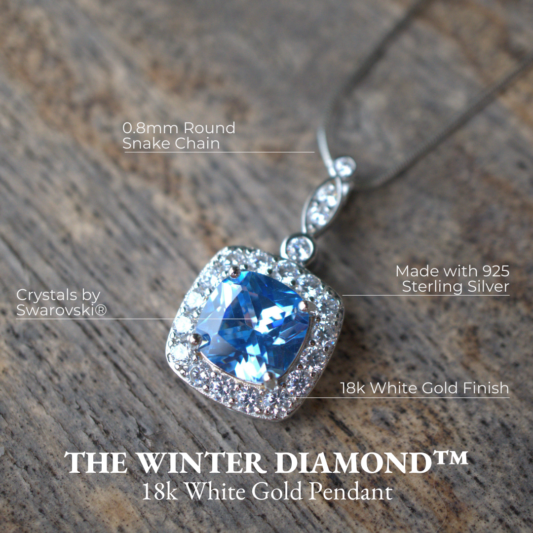 Keep your story close to your heart with the Winter Diamond™ Pendant. This exquisite 18K white gold pendant (on an adjustable 18" sterling silver chain) carries the icy-blue topaz that shimmers like morning dew, symbolizing that summer’s magic is born from winter’s dreams. As the seasons turn, this pendant reminds you that preparation and patience through life’s winters lead to beautiful blooms in spring. It’s your personal guiding light through every season – a little piece of winter wonder that warms the soul year-round (and unlike real snowflakes, this one won’t melt!).