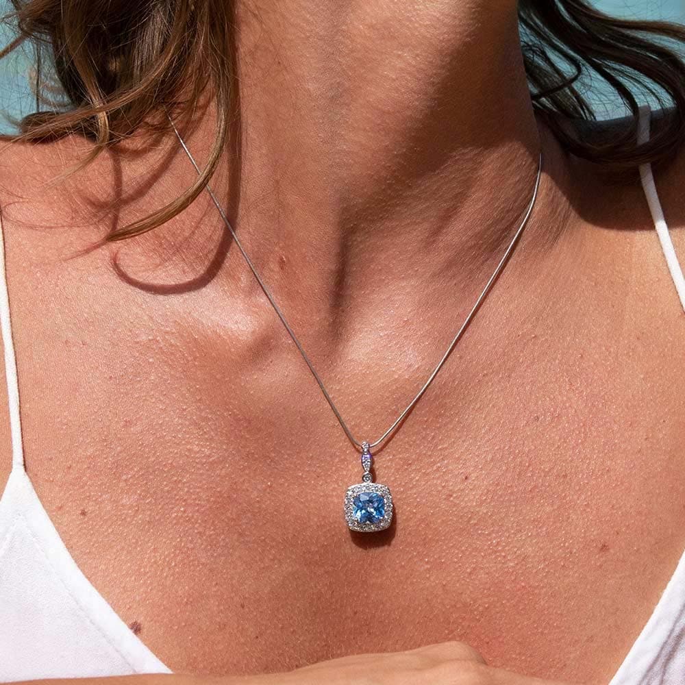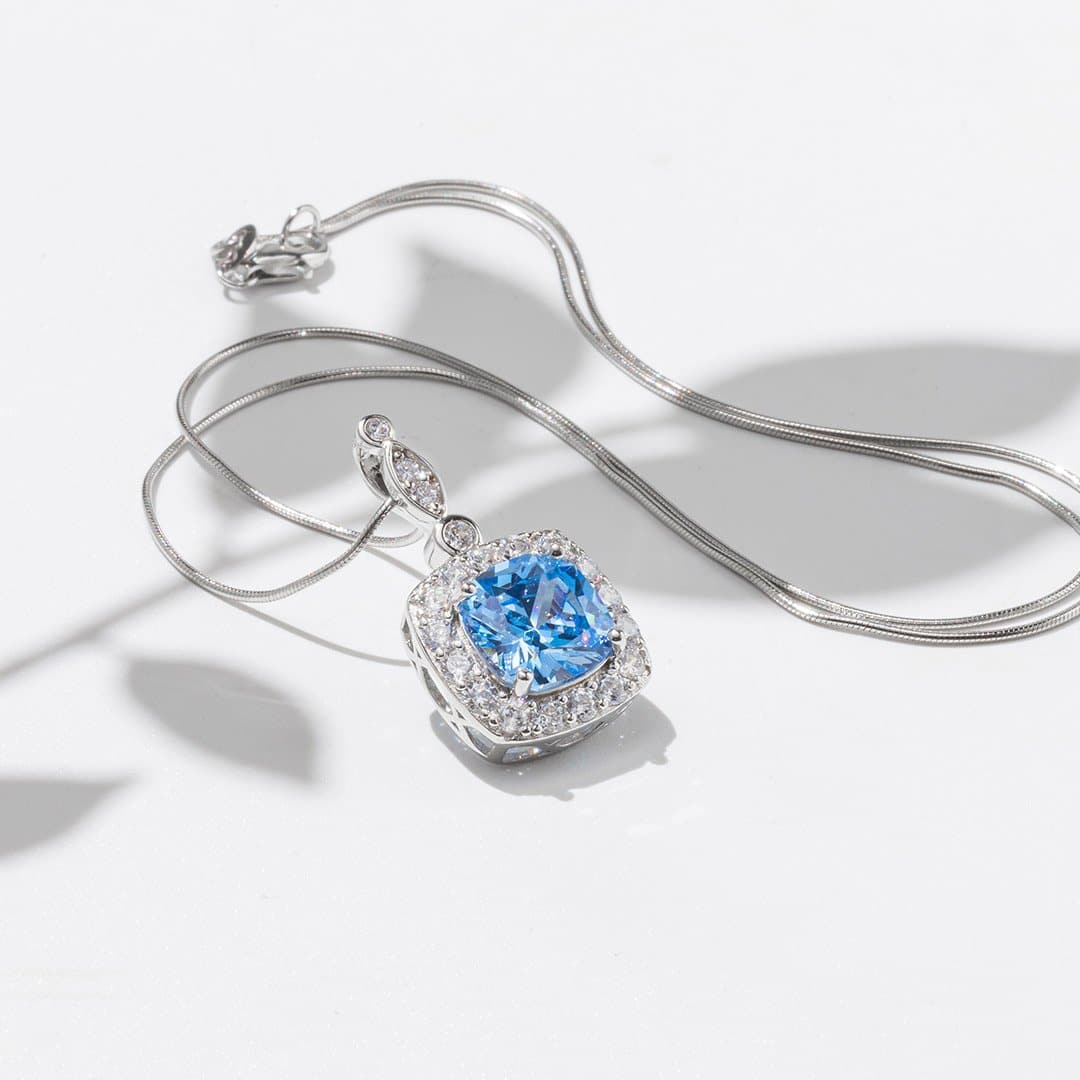 - Gemstone: Natural blue topaz, cushion-cut ~3ct, sparkling with oceanic blue clarity